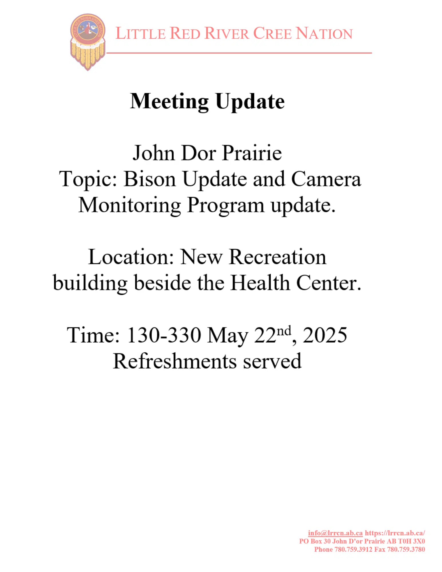 Little Red River Cree Nation has administrative centers in Fox Lake, John D’Or Prairie (central office), and Garden River. Hours of operation for each location is from Monday to Friday, 9:00am to 5:30pm and closed from 12:00pm to 1:00pm for lunch. All Nation facilities are also closed during statutory holidays.
