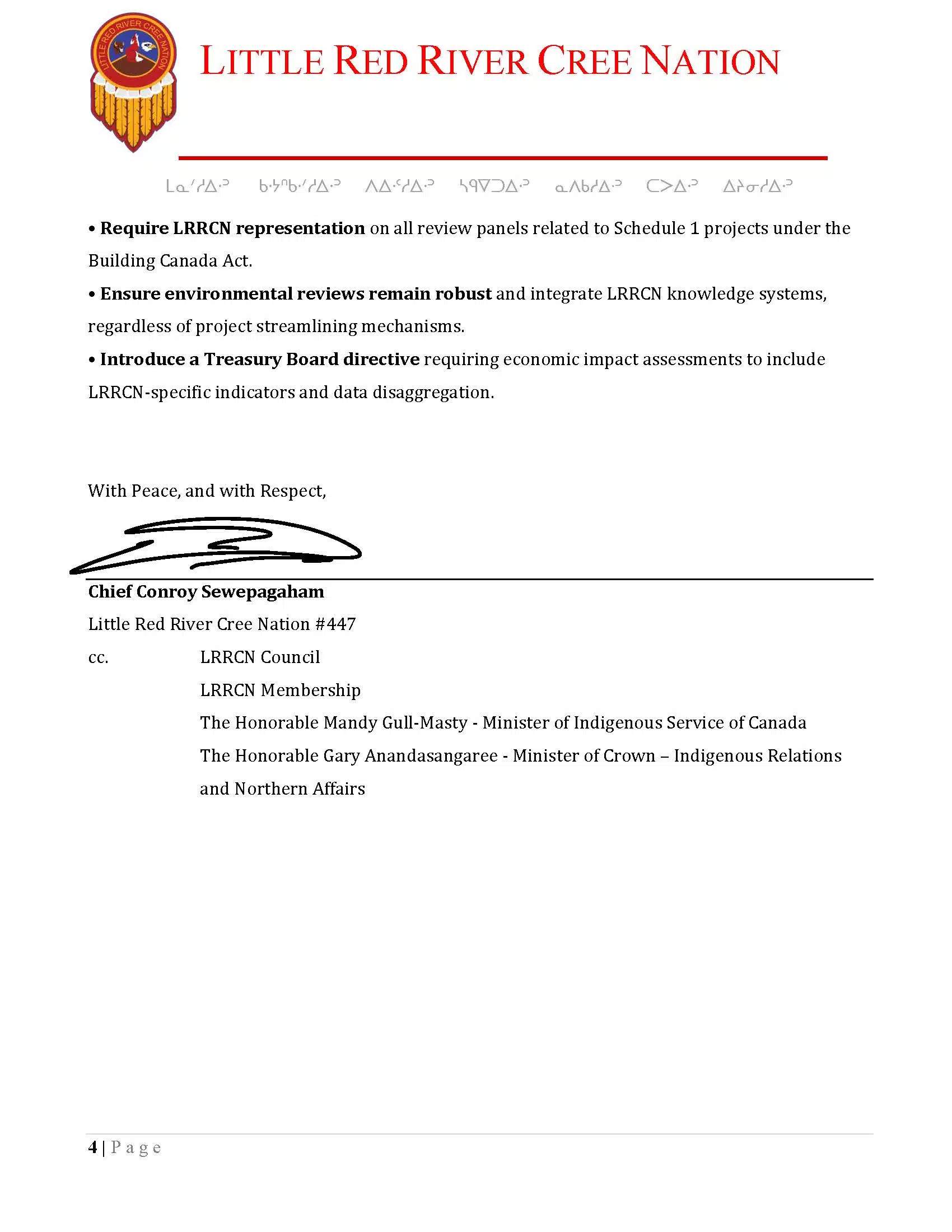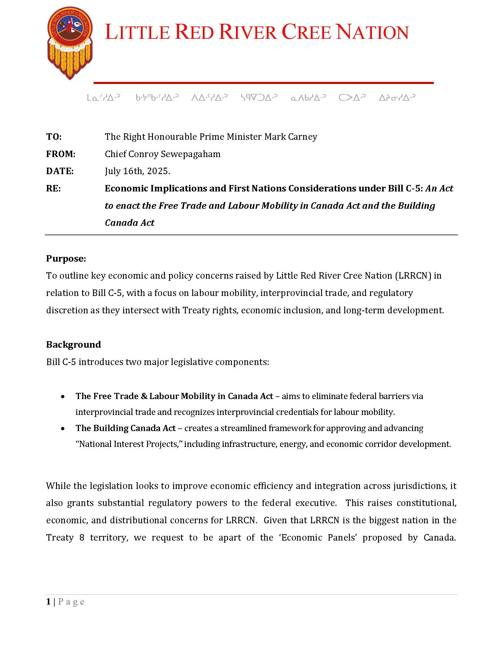 Chief Sewepagaham Delivers Letter to Prime Minister Mark Carney Chief Sewepagaham hand delivers a letter to Prime Minister Mark Carney on behalf of the people of the Little Red River Cree Nation. July 17th, 2025. Ottawa, Ontario July 17, 2025| Share This Story, Choose Your Platform! FacebookXRedditLinkedInWhatsAppTumblrPinterestVkXingEmail About the Author: info@lrrcn.ab.ca Related Posts Pasokontotak Empowerment Conference – Call for Vendors Pasokontotak Empowerment Conference – Call for Vendors Pasokontotak Empowerment Conference 2025 Pasokontotak Empowerment Conference 2025 Seeking LRRCN Speakers for Pasokontotak Empowerment Conference Seeking LRRCN Speakers for Pasokontotak Empowerment Conference Emergency Sharing Circle – Happening September 25, 2025 Emergency Sharing Circle – Happening September 25, 2025