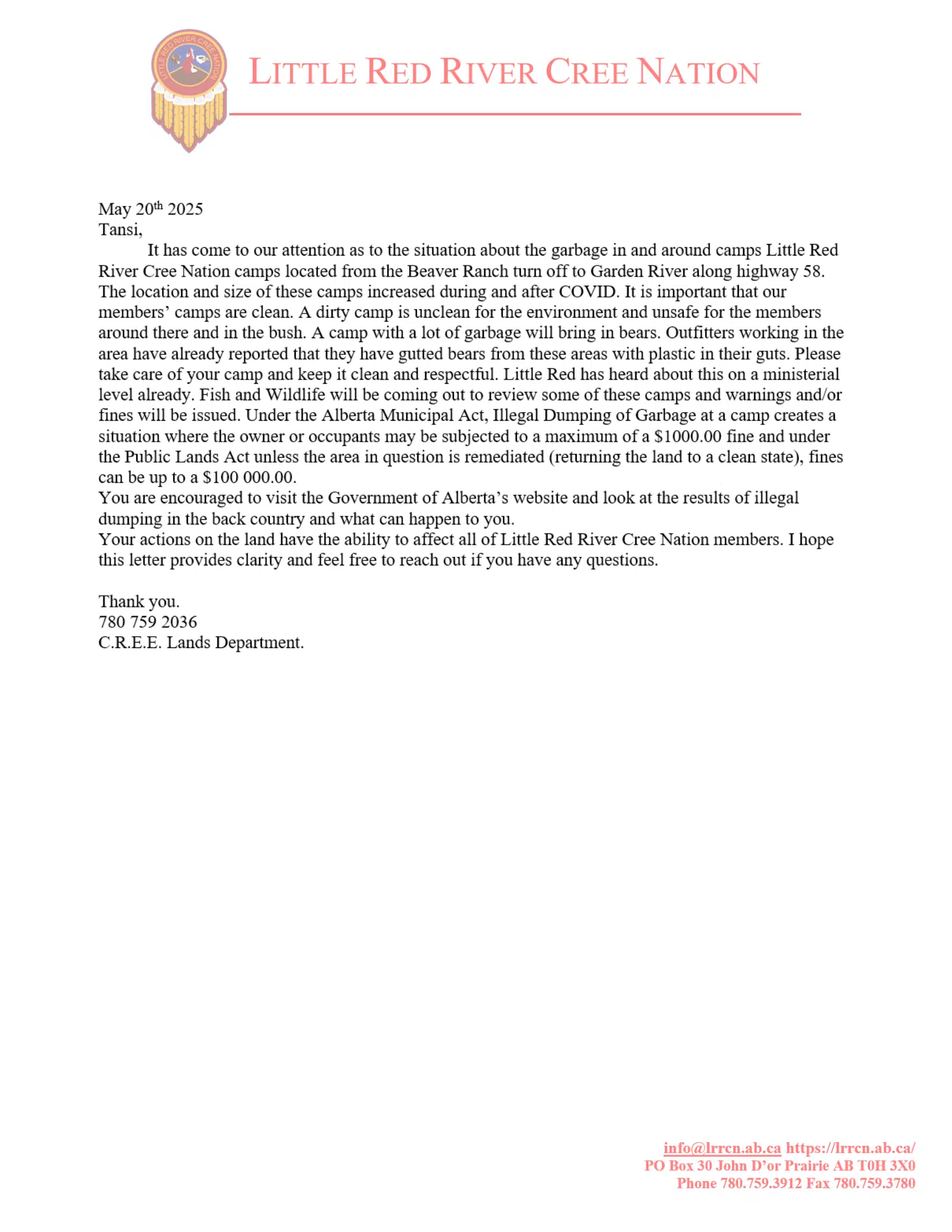 Community Notice May, 20th 2025 May 23, 2025| Share This Story, Choose Your Platform! FacebookXRedditLinkedInWhatsAppTumblrPinterestVkXingEmail About the Author: info@lrrcn.ab.ca Related Posts Wabasca Ice Bridge Update December 8, 2025 Wabasca Ice Bridge Update December 8, 2025 Disaster Preparedness and Risk Reduction Online Learning Series – Winter Storms & Extreme Cold – Now Available Disaster Preparedness and Risk Reduction Online Learning Series – Winter Storms & Extreme Cold – Now Available Official Statement from Chief and Council, re: Blockades near John D’Or Prairie Official Statement from Chief and Council, re: Blockades near John D’Or Prairie Notice: Fox Lake Bridge, Crossing over the Peace River Notice: Fox Lake Bridge, Crossing over the Peace River