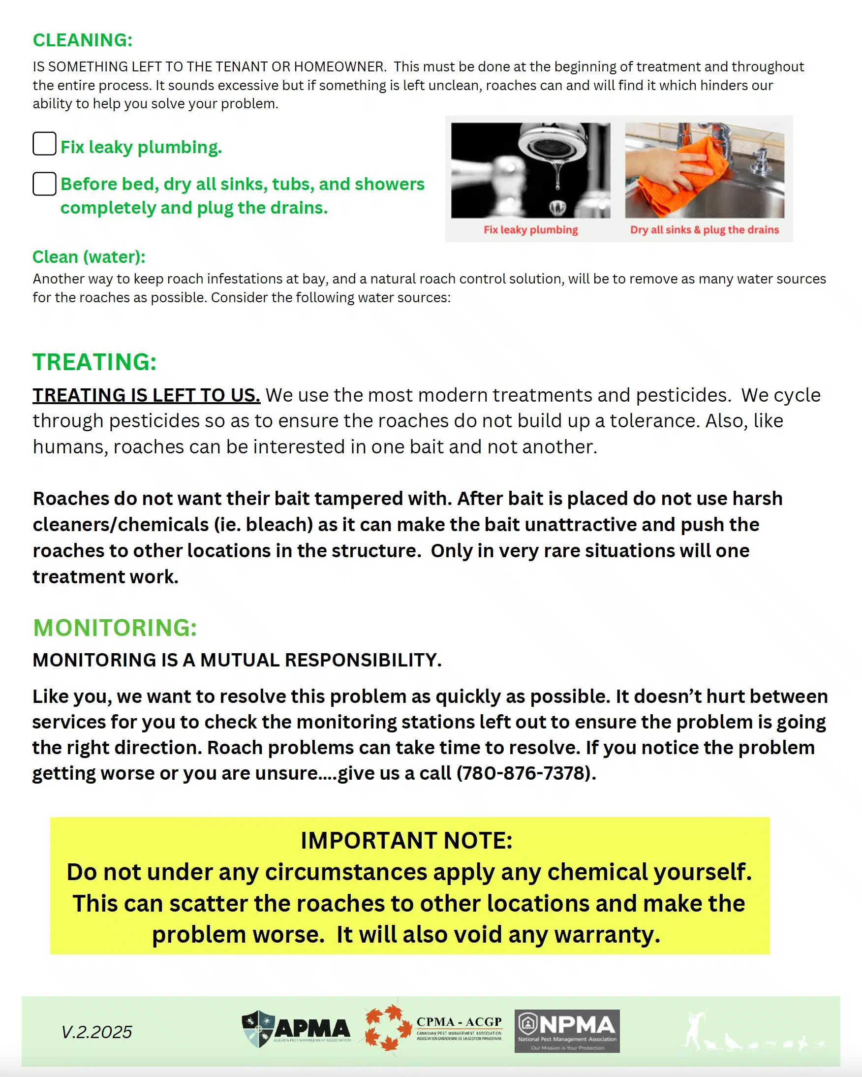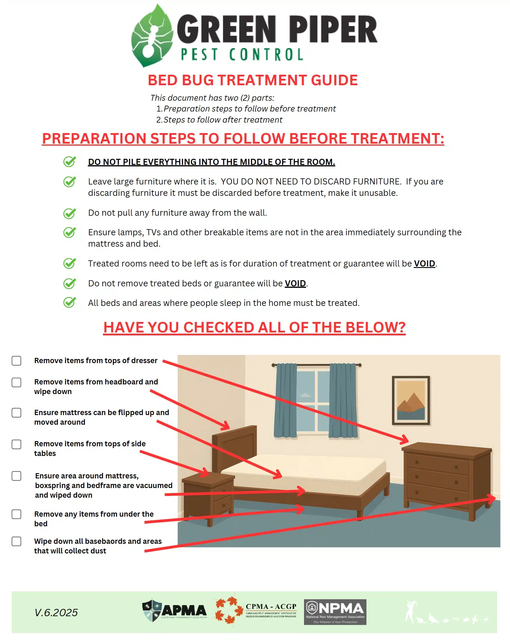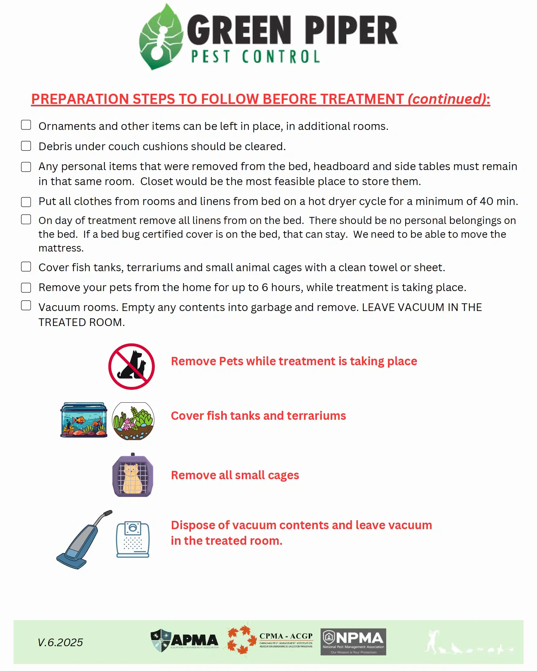 Below, please see the bed bug treatment preparation sheet and roach treatment preparation sheet, should you require these services.